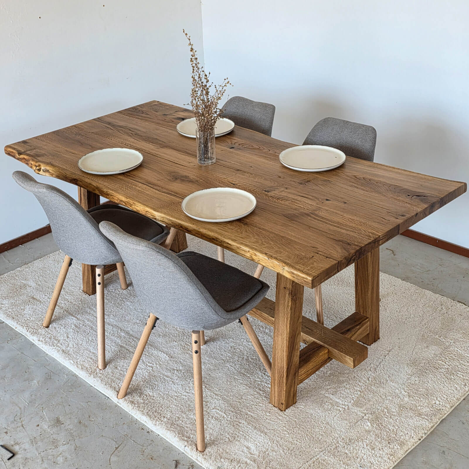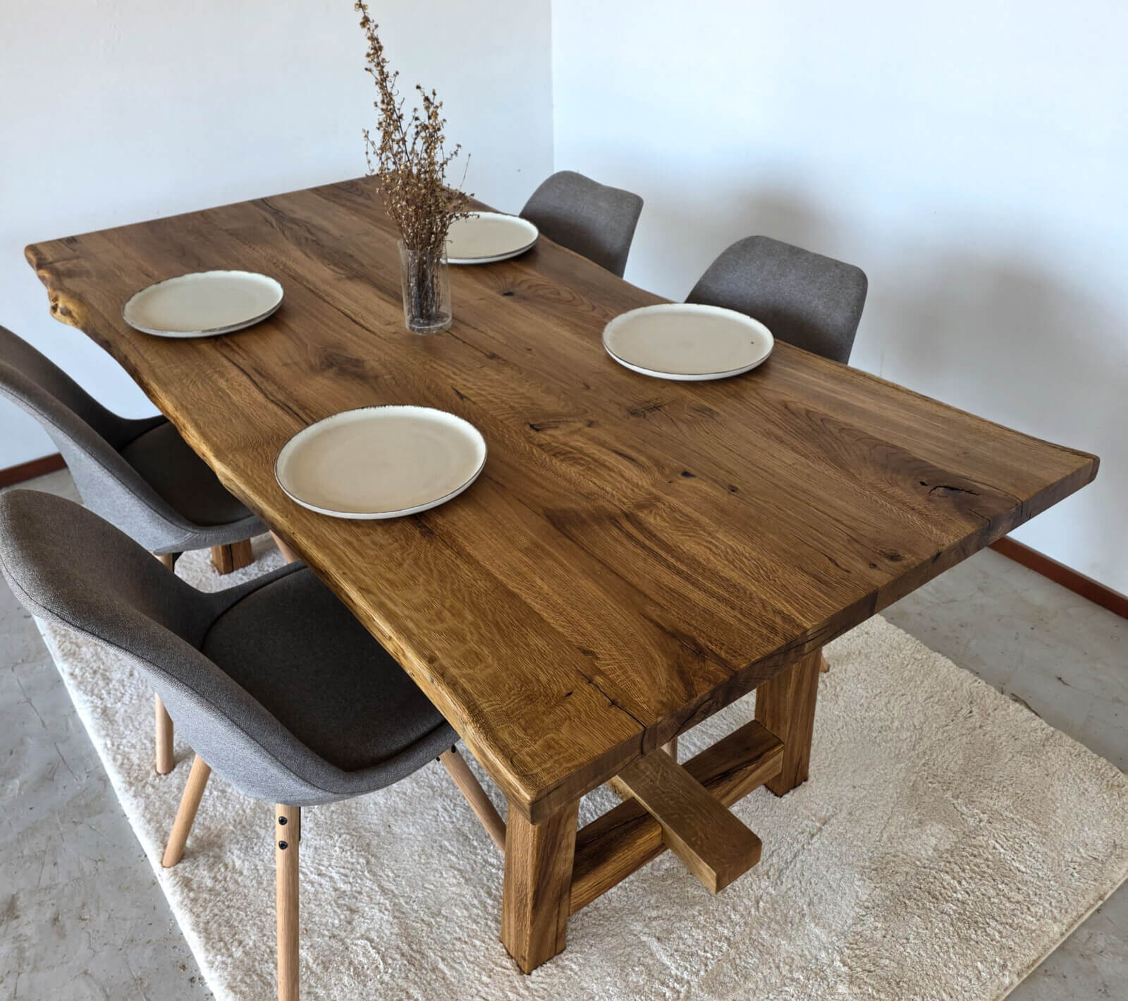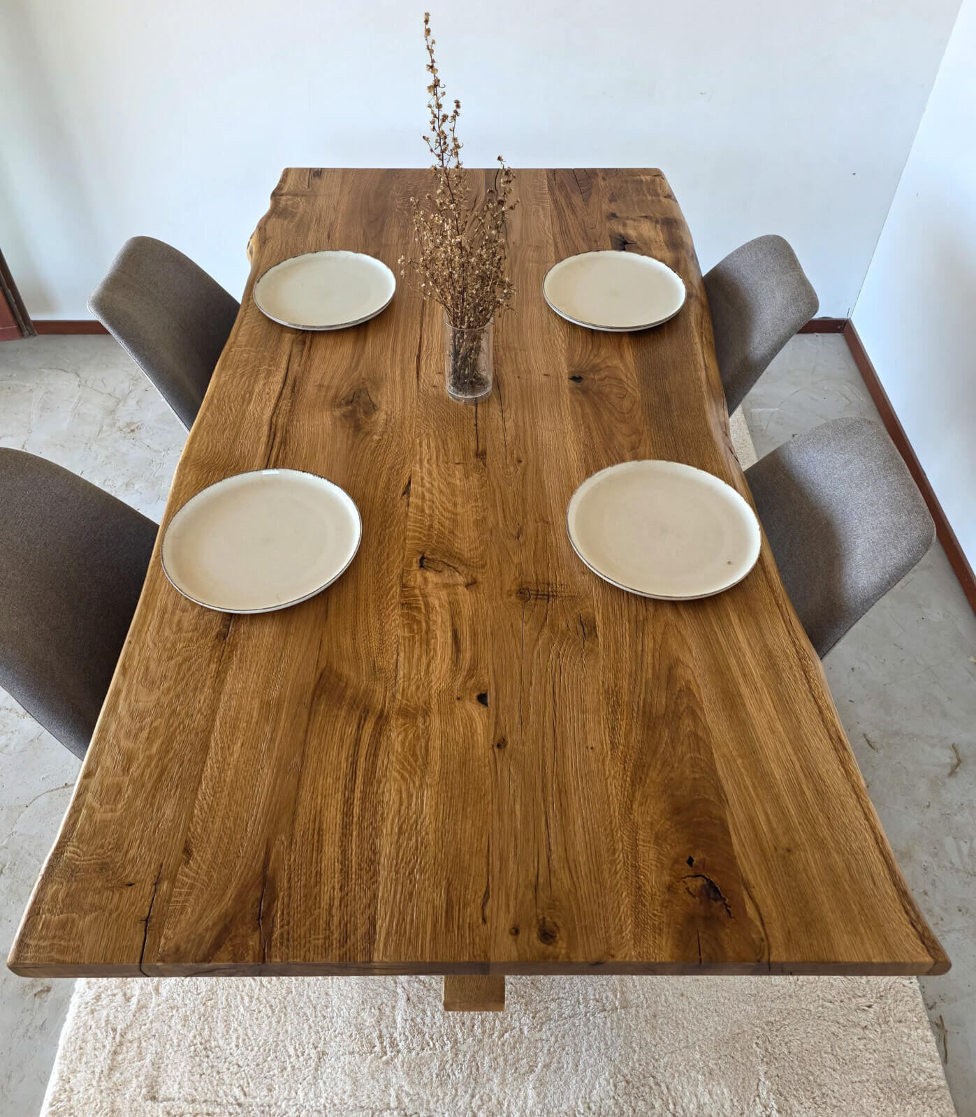 Η επιφάνεια του ξύλου έχει υποστεί επεξεργασία ώστε να αναδεικνύεται η φυσική υφή και τα νερά της δρυός, δημιουργώντας ένα αποτέλεσμα με βάθος και χαρακτήρα. Κάθε τραπέζι είναι μοναδικό, καθώς το ξύλο διατηρεί τα φυσικά του στοιχεία.