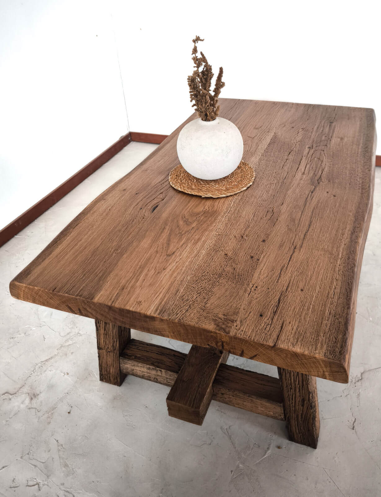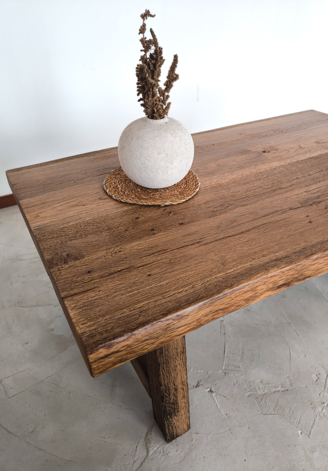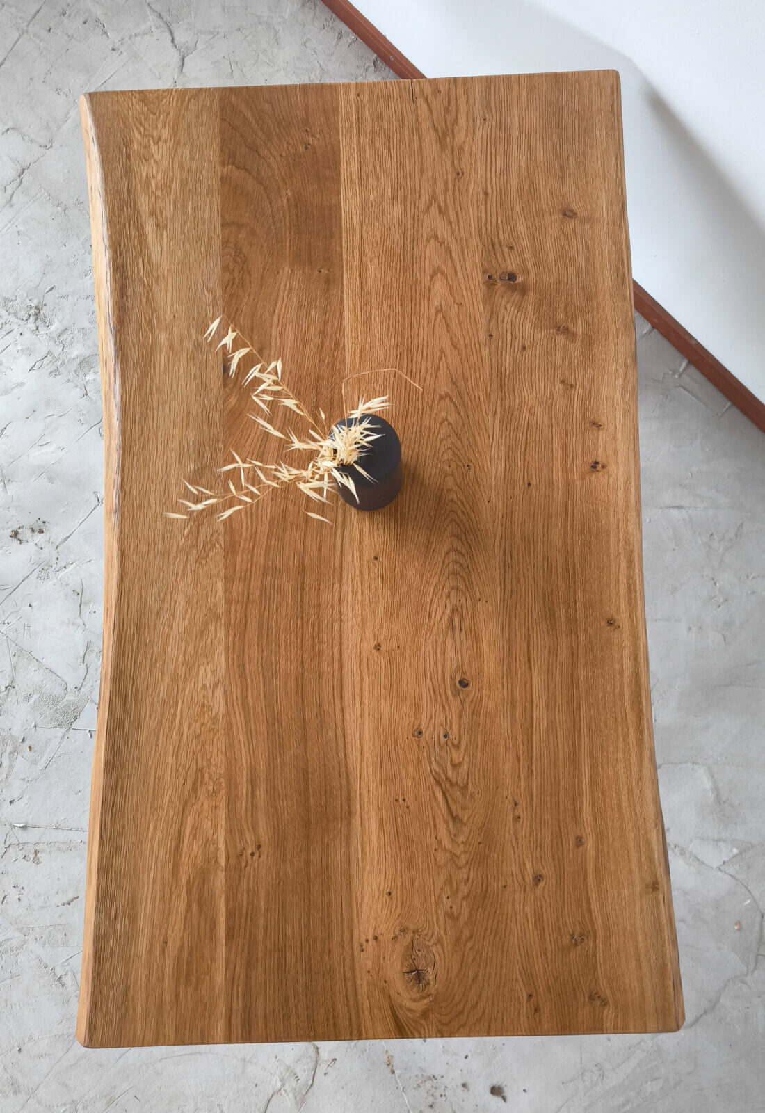 Η επιφάνειά του κατασκευάζεται από μασίφ δρυ, με ακατέργαστες φυσικές άκρες, διατηρώντας τον αυθεντικό χαρακτήρα του ξύλου και αποκαλύπτοντας τα νερά, τους ρόζους και τη μοναδικότητα κάθε κομματιού.
