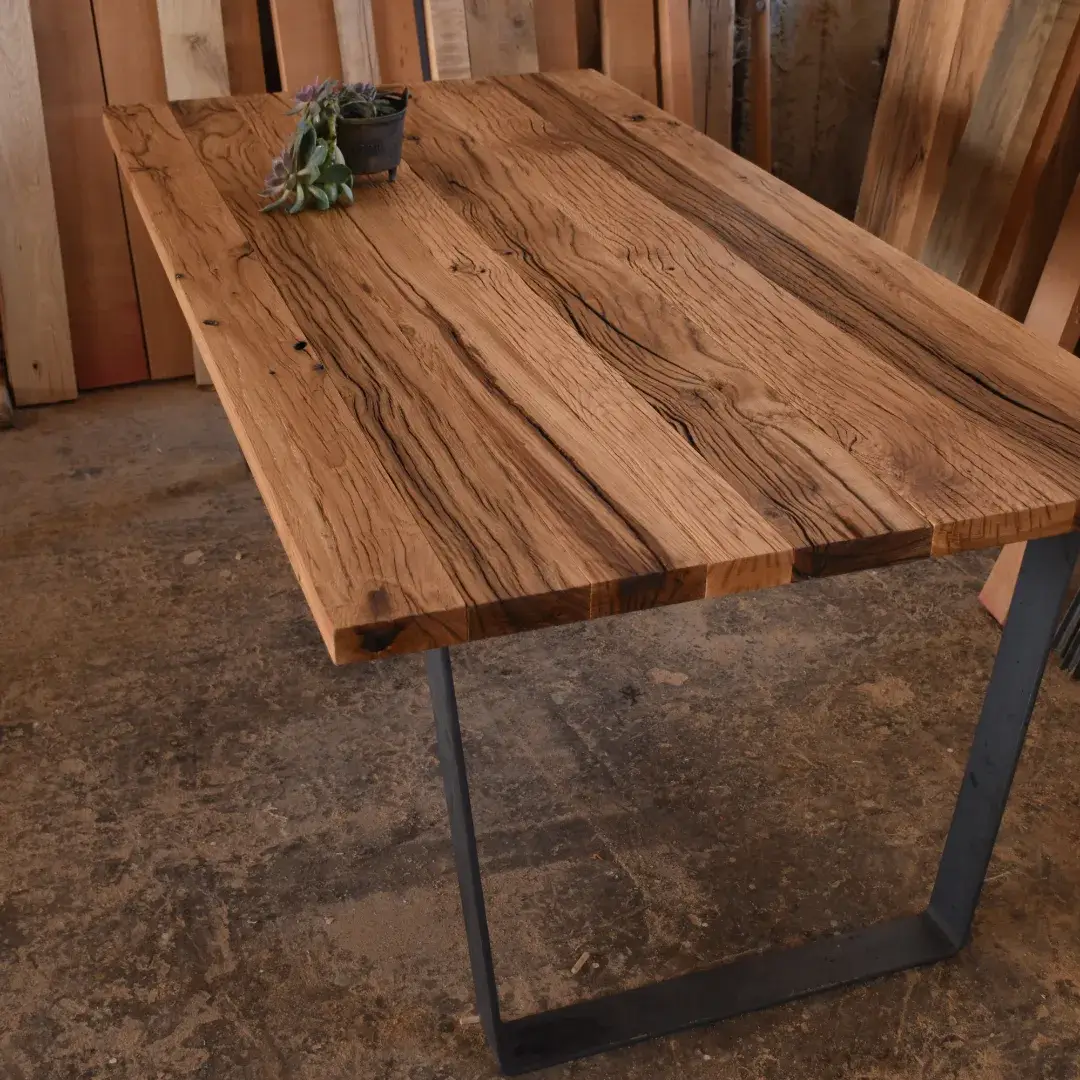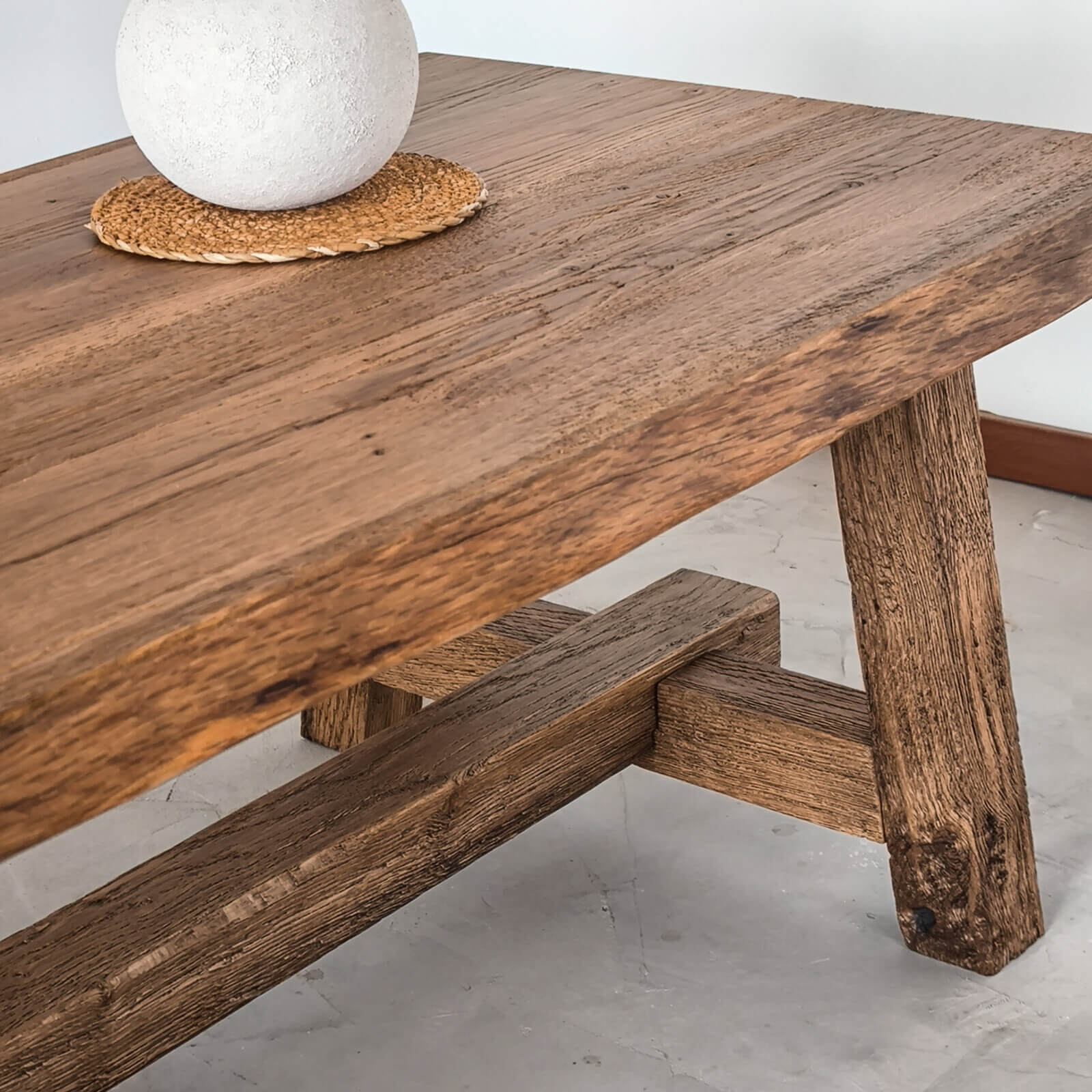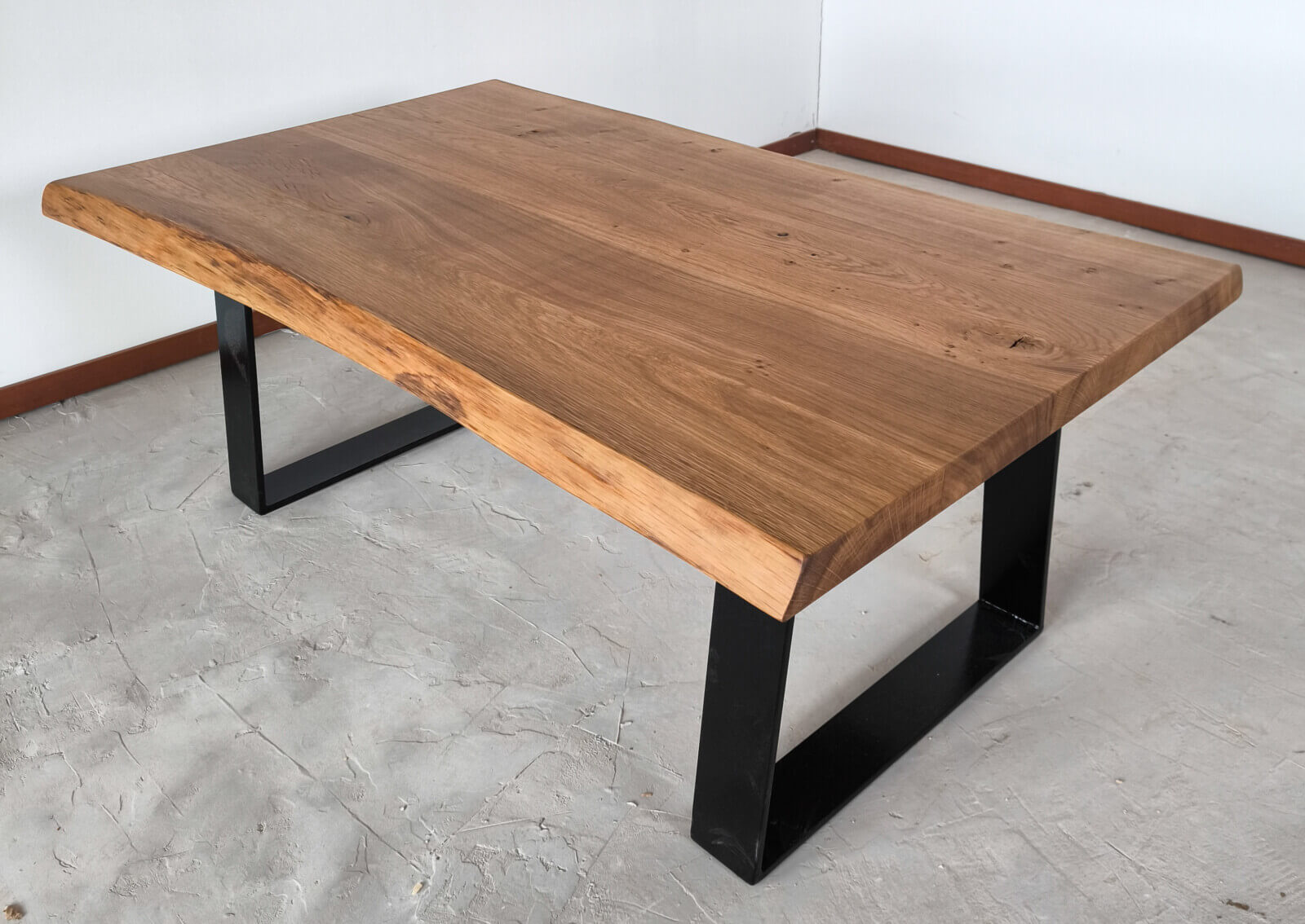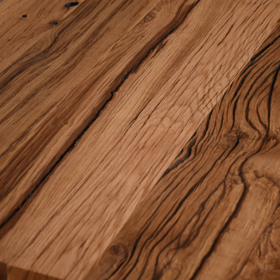 Η επιφάνειά του κατασκευάζεται από μασίφ δρυ, με ακατέργαστες φυσικές άκρες, διατηρώντας τον αυθεντικό χαρακτήρα του ξύλου και αποκαλύπτοντας τα νερά, τους ρόζους και τη μοναδικότητα κάθε κομματιού.